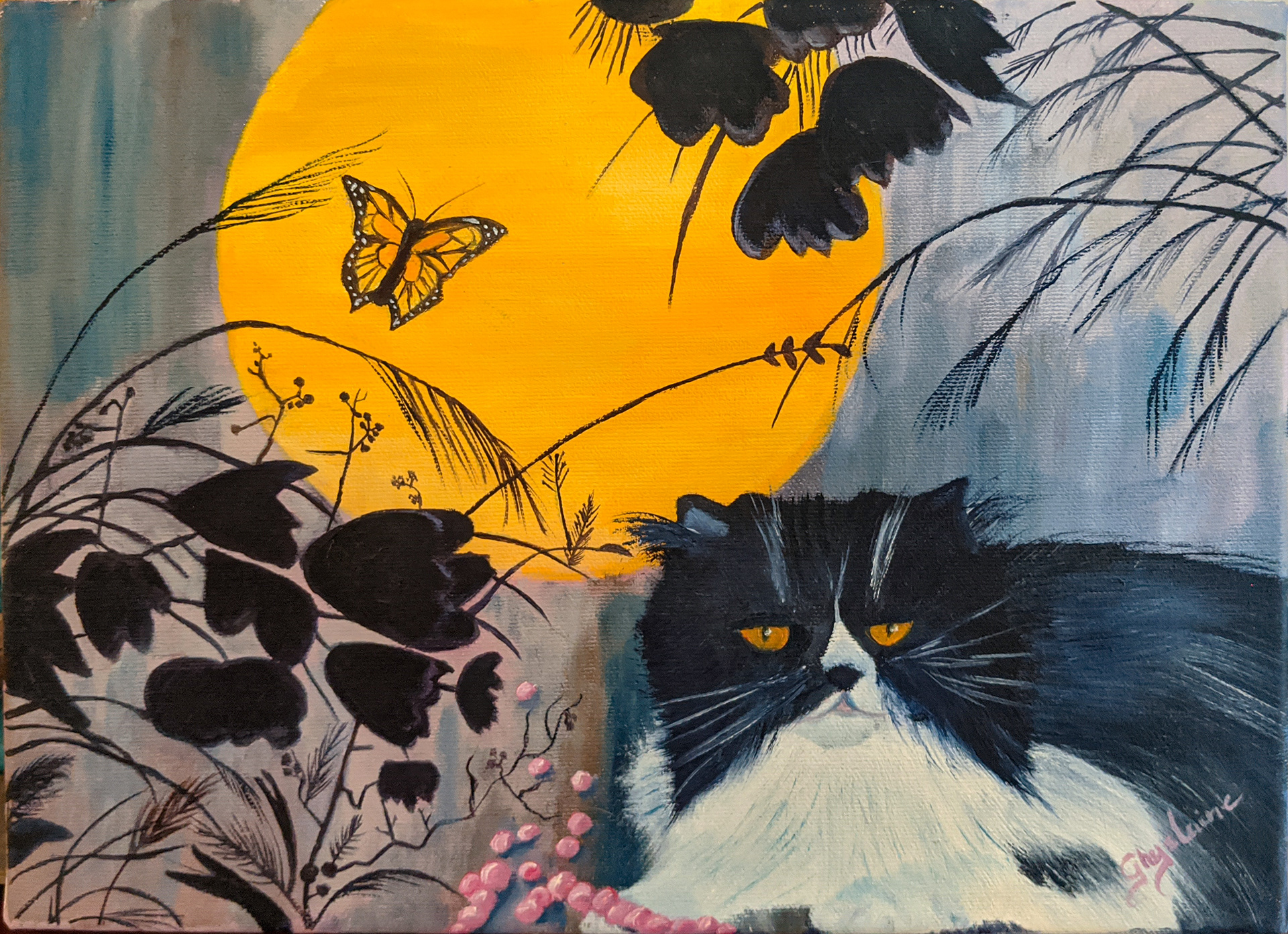 Une peinture représentant ma chatte dans un décor un onirique. Une grosse lune orange veille sur elle alors qu’un papillon volete entre les fleurs noires.