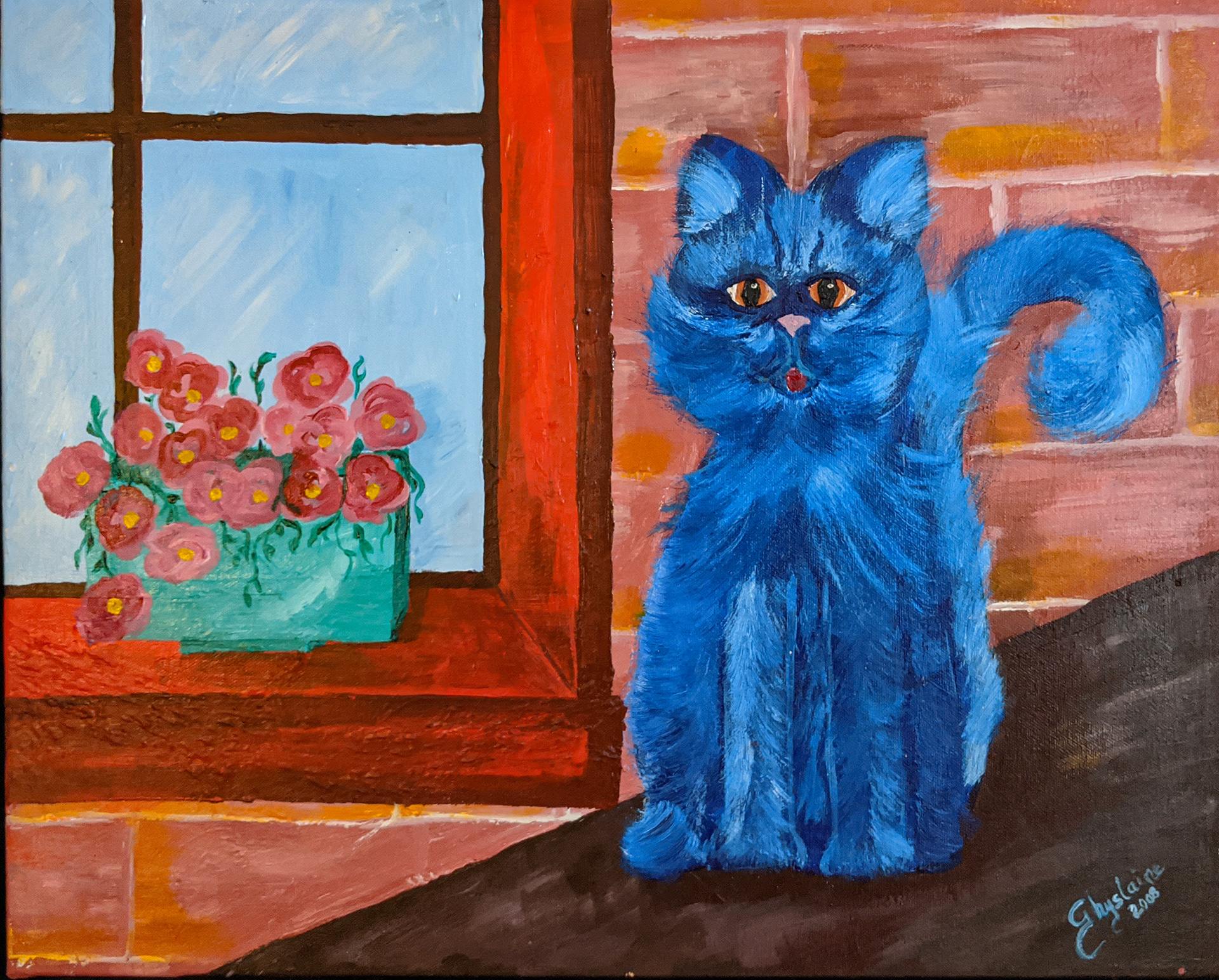 En tant qu'artiste, je profite de ma liberté de création pour peindre dans les couleurs qui me parlent. Pour cette oeuvre, j'ai décidé que mon chat sur le toit serait d'un beau bleu vif.
